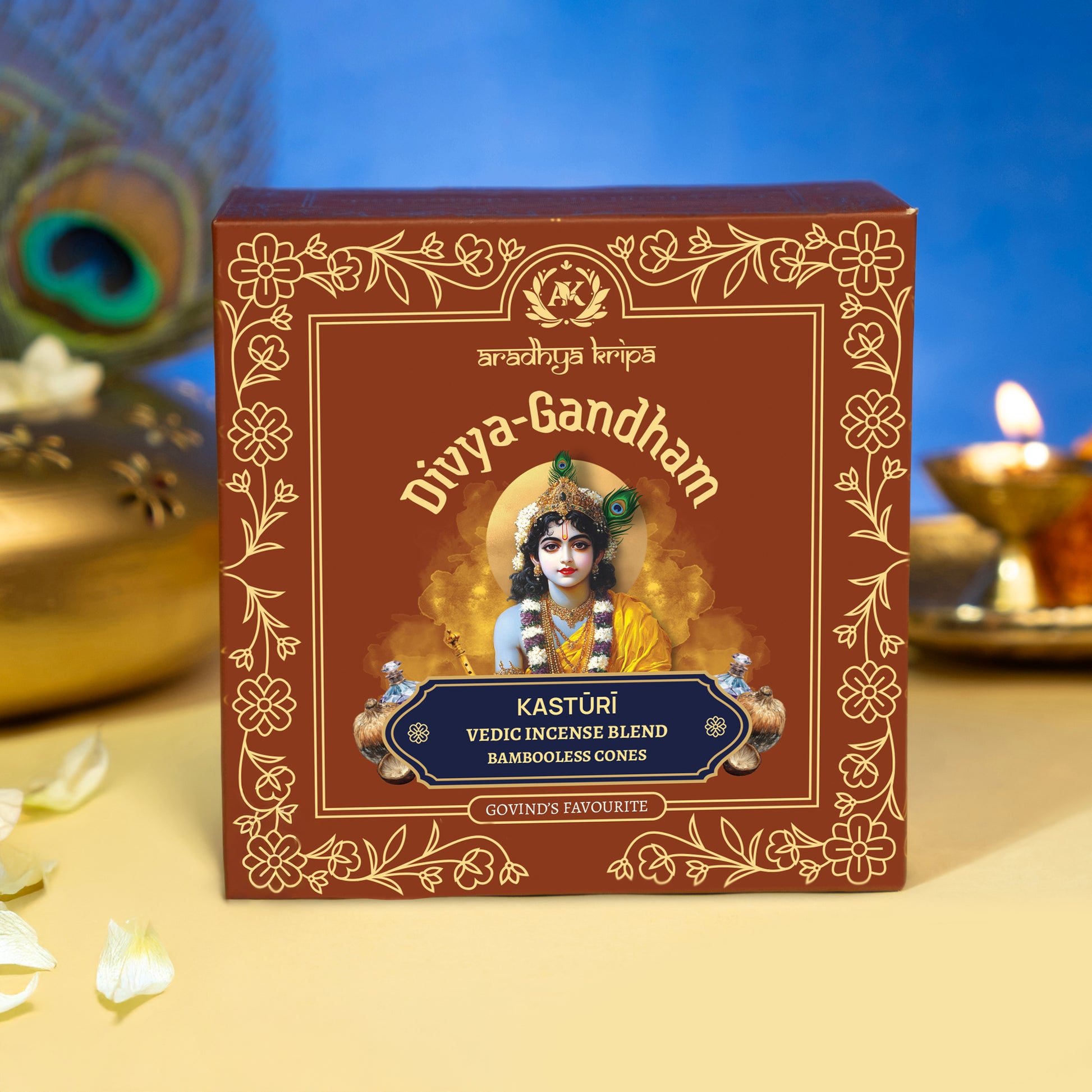 Kasturi is not just fragrance — it is Krishna’s very charm made visible. The musk tilak on his forehead reflected the ākarṣaṇa-śakti that drew everyone to him; the Gopīs, the cows of Vṛindāvan, even the devas themselves. To light Kasturi incense is to invoke that same irresistible grace, fragrance that attracts the heart and makes the Puja-ghar radiant with his presence.