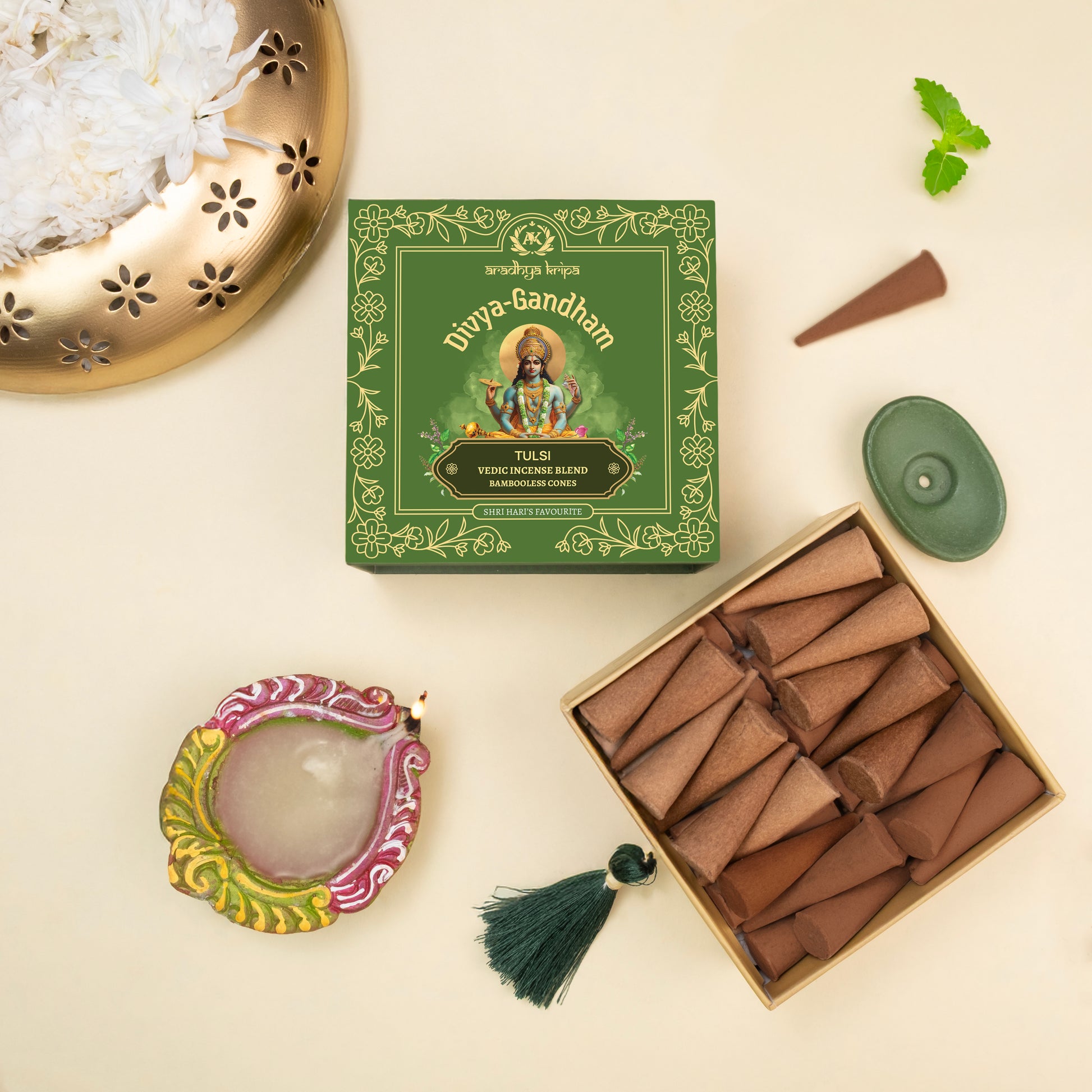 Tulsi is Shree Vishnu’s most sacred companion. Revered in the Padma Purana as his dearest consort, no puja to Shreeman Narayan is complete without Tulsi. This incense carries her fragrance into your Puja-ghar, offering Bhagwan Vishnu what he loves most.